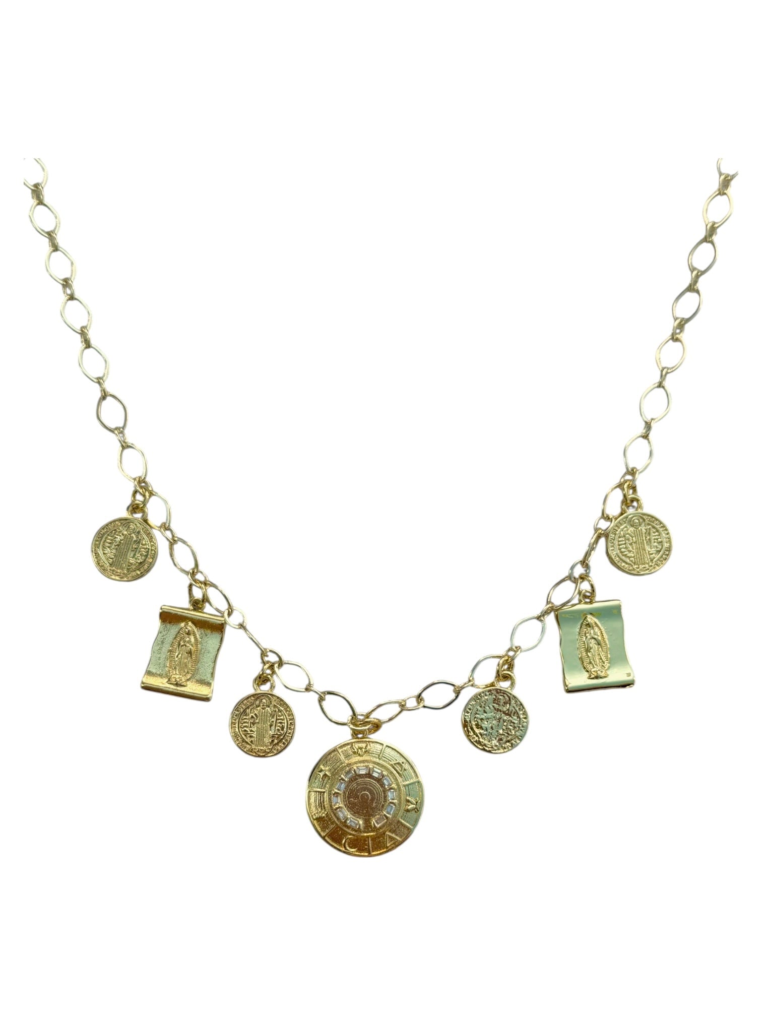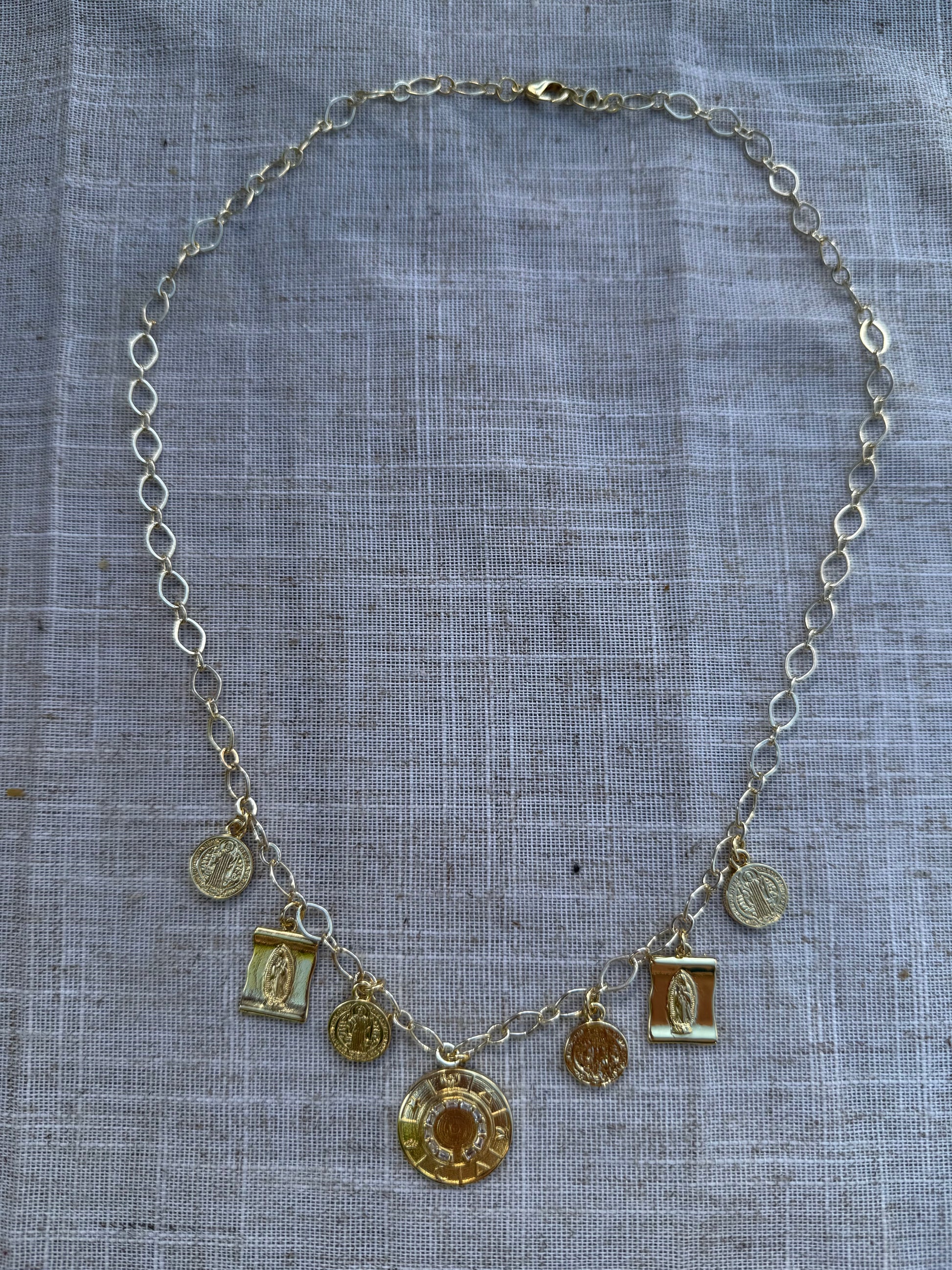 18k gold filled chain with 18k gold filled pendants. Adjustable up to 20 inches.