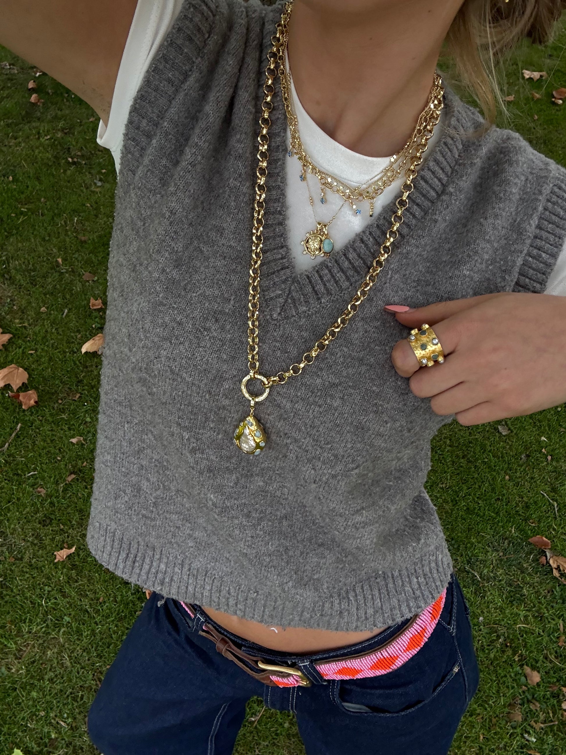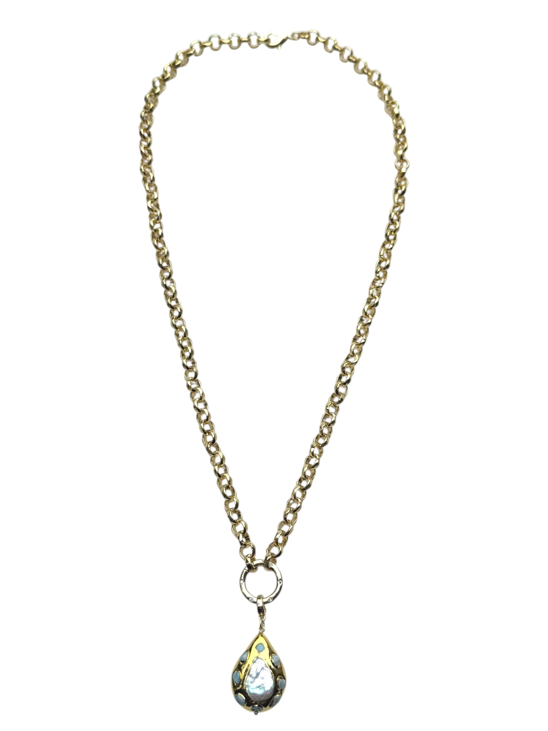 18k gold plated adjustable long necklace with a removable amazonite and pearl teardrop charm.