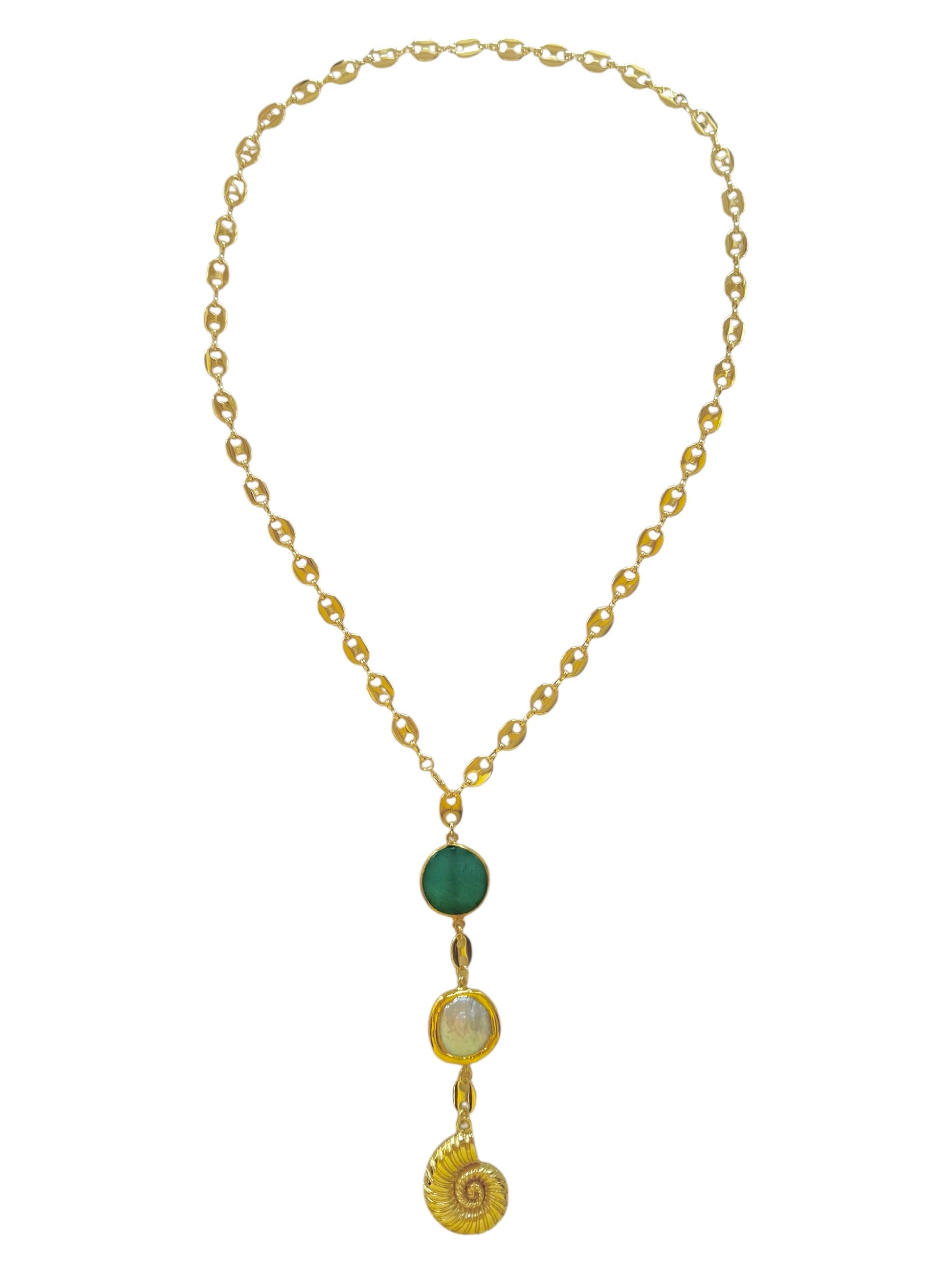 18k gold plated long necklace with turquoise jade gemstone charm and pearl charm. Adjustable lariat necklace shape.