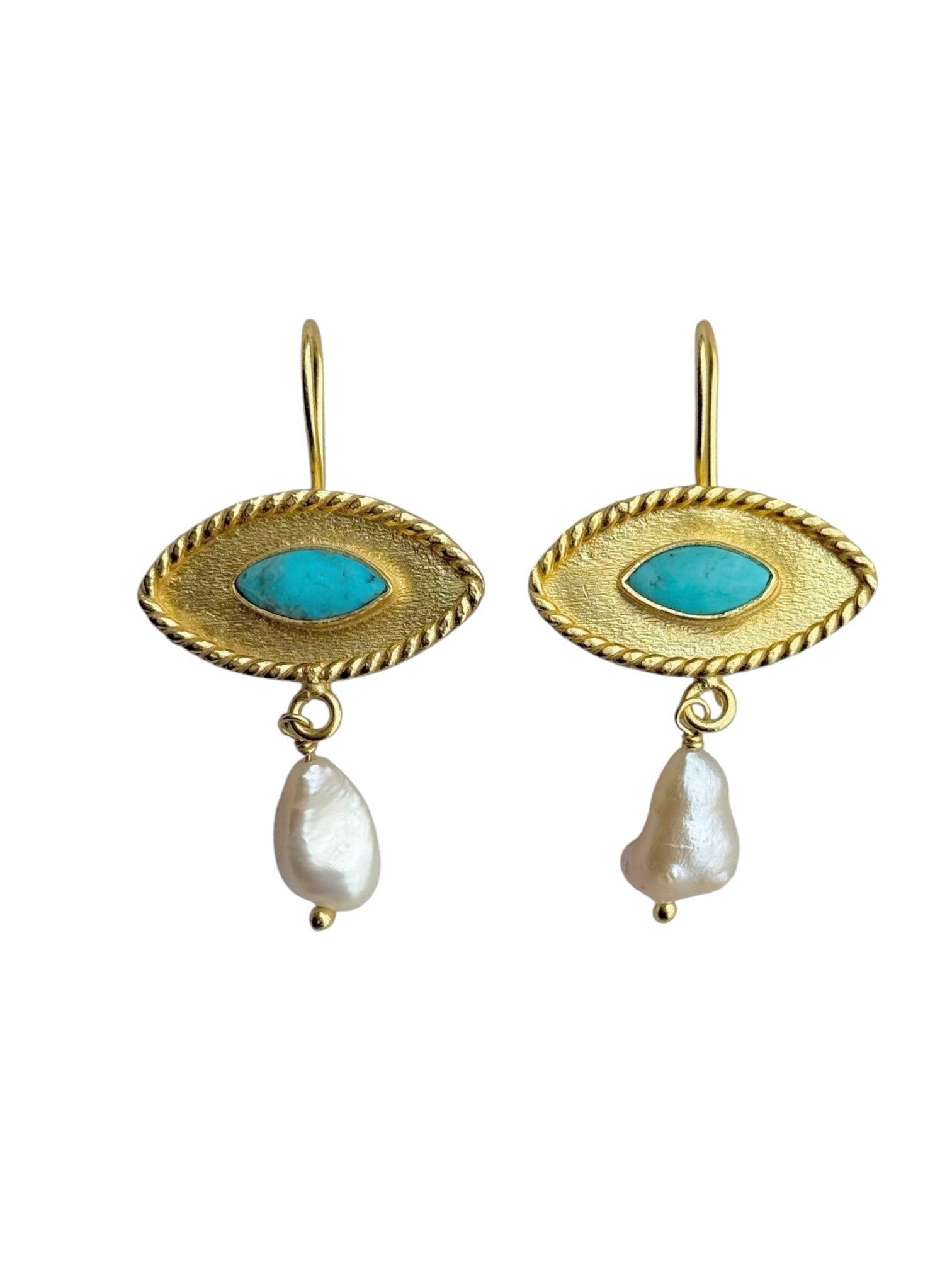 18k gold plated fishhook earrings with real Turquoise gemstones and freshwater pearls.