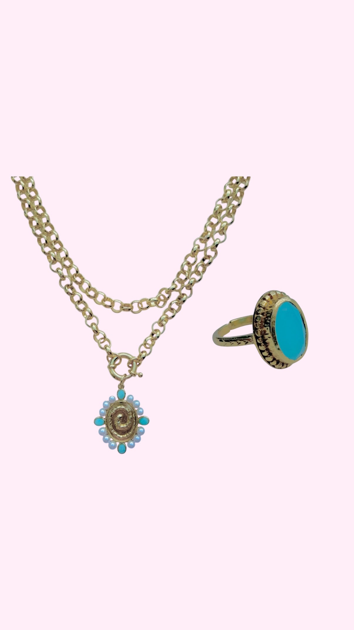 Featuring the Isadora double necklace adorned with an amazonite and pearl charm, paired with the Samara blue quartz ring, this set brings a fresh, ocean-inspired feel to any look.
