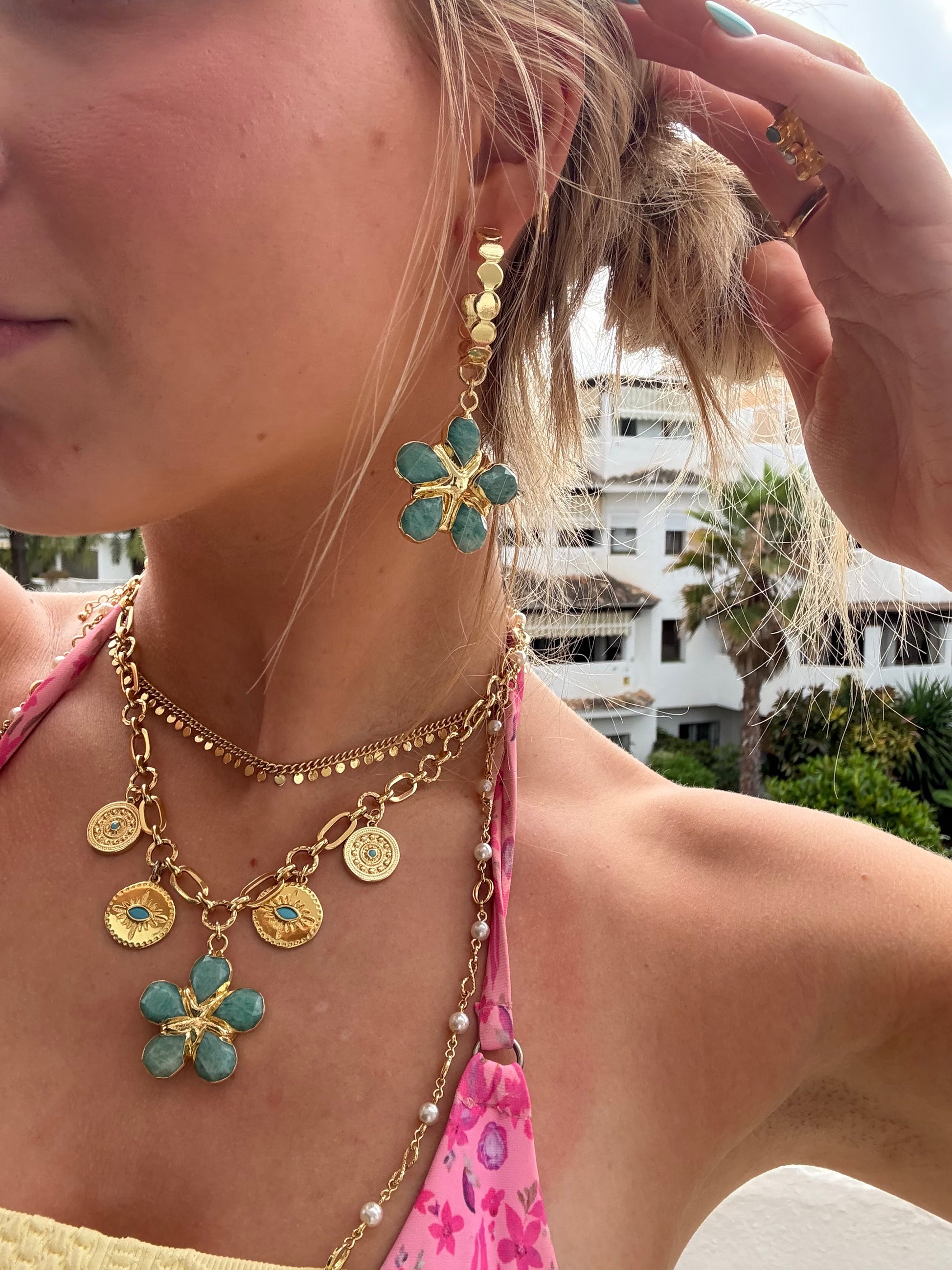 18k gold plated flower amazonite hoop earrings.