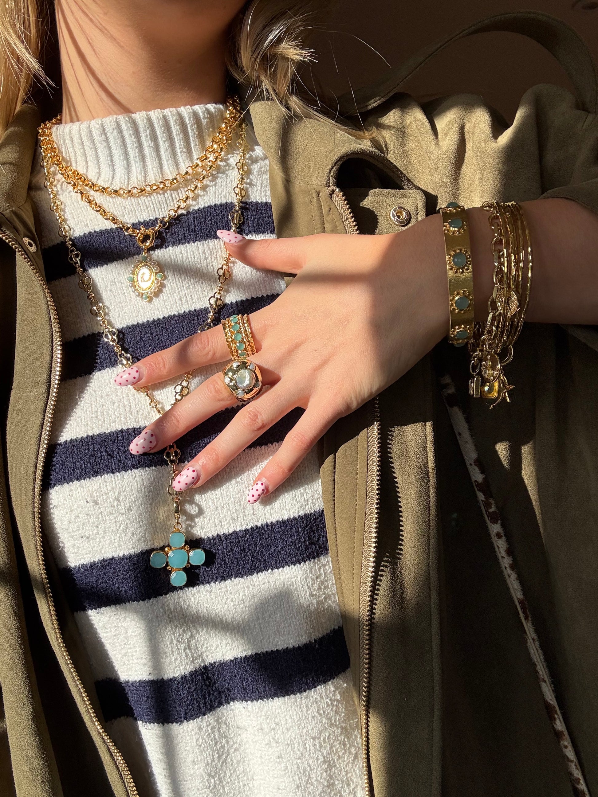 18k gold plated bangle with 5 thin bangles attached together with 3 charms.