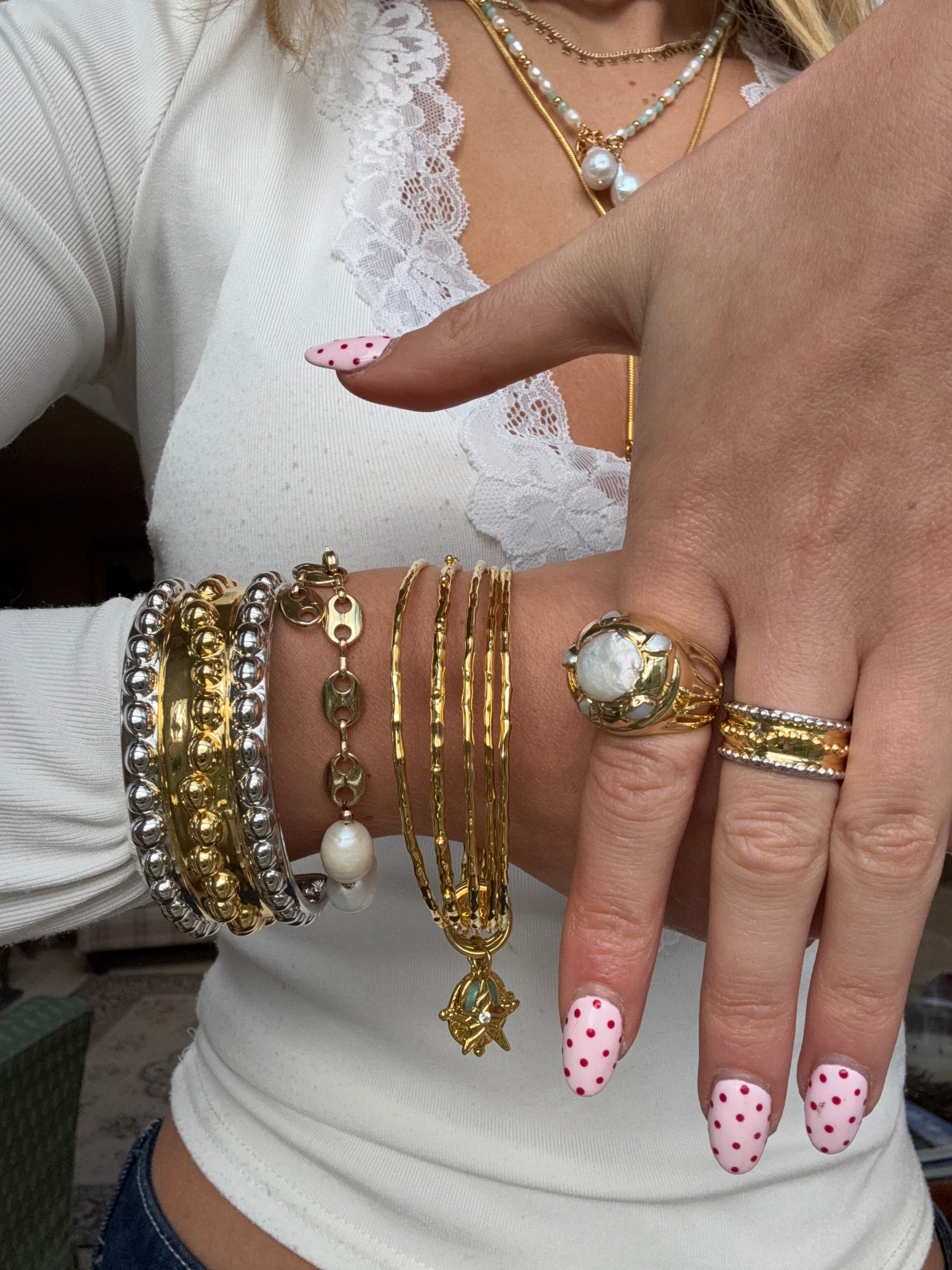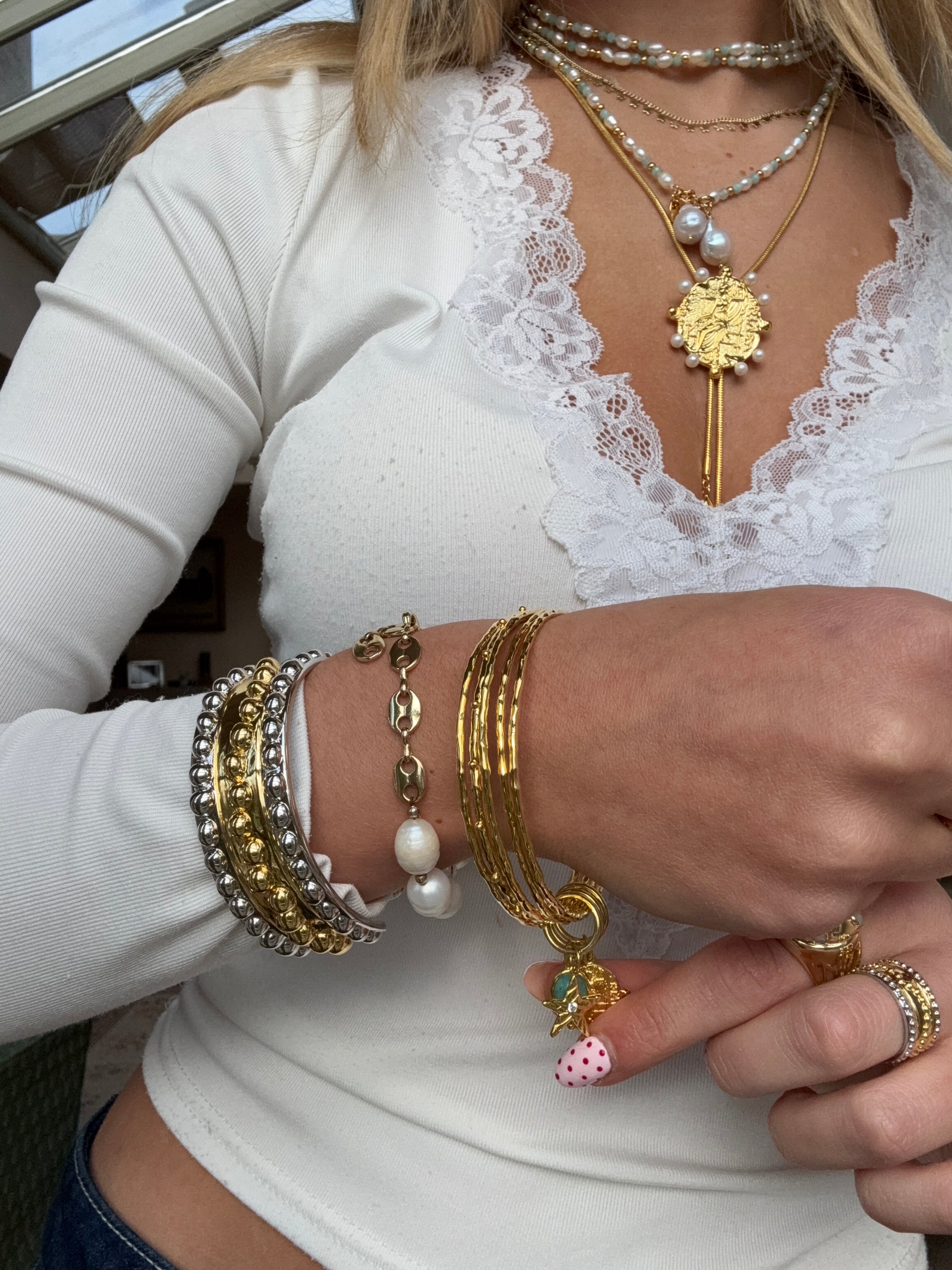 Timeless with a modern edge, the Ophelia Bundle is designed to elevate every outfit with effortless elegance. Featuring an adjustable bolo tie necklace adorned with a Roman coin and freshwater pearl pendant, paired with a coordinating gold bangle. The adjustable necklace allows you to wear it long, short, or layered.